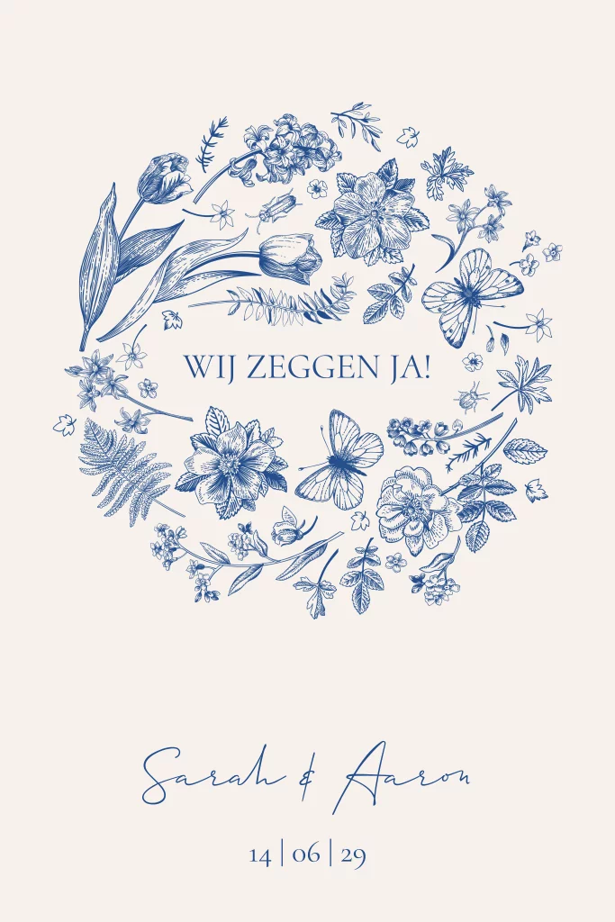 Romantische trouwkaart met een klassiek bloemendesign in diepblauw. In het midden staat de tekst "Wij zeggen ja", omringd door een verfijnde krans van bloemen, vlinders en bladeren in illustratieve stijl. De namen van het bruidspaar en de trouwdatum staan eronder in een klassieke typografie. Deze delfts blauwe trouwkaart met florale details past perfect bij een bruiloft met een tijdloos, botanisch of vintage thema.