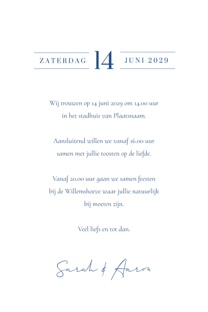 Trouwkaart met bloemenkrans in Delfts blauw stijl