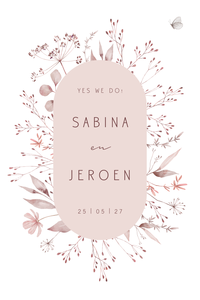 Stijlvolle trouwkaart met ronde hoeken en een krans van kleine roze bloemetjes. In de bloemenkrans staan de namen van het bruidspaar. De achtergrond is wit, dus kies voor een mooie papiersoort bijvoorbeeld linnen, oud-hollands of tinteretto. Je kunt deze kaart zelf bewerken in de editor en naar je eigen wens aanpassen.