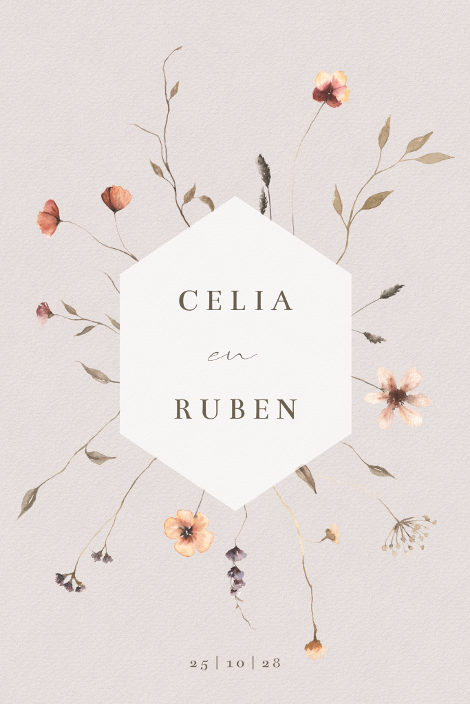 Maak een onvergetelijke indruk met onze stijlvolle trouwkaart met een prachtige beige structuur achtergrond. De kaart is verfraaid met een elegante zeshoek, omringd door een kleurrijk boeket van unieke veldbloemen. Elk bloemetje is met zorg uitgekozen, waardoor deze trouwkaart een charmante en persoonlijke touch krijgt.
