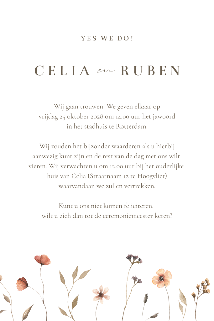 Wanneer je de kaart opent, word je begroet door een betoverende strook met veldbloemen aan de onderkant. De binnenzijde biedt voldoende ruimte om al jullie belangrijke trouwdetails en persoonlijke boodschappen toe te voegen.
