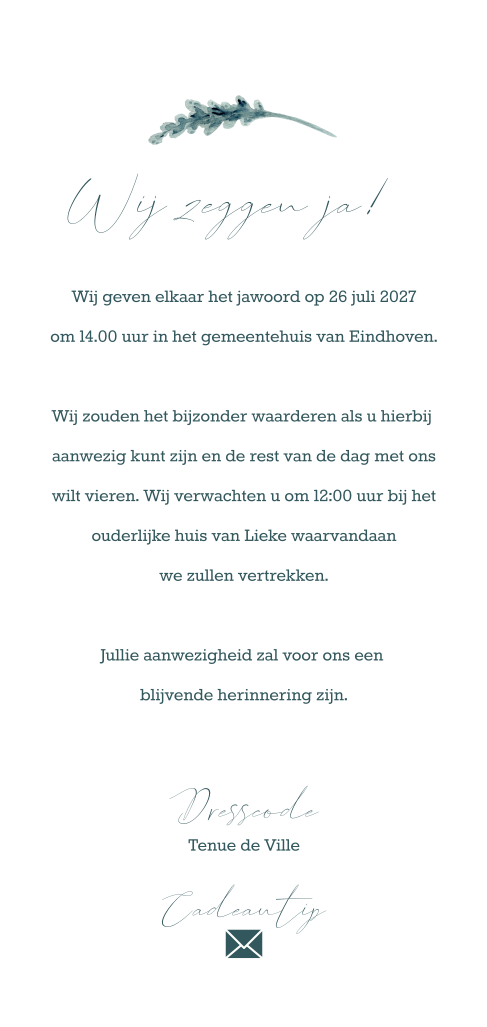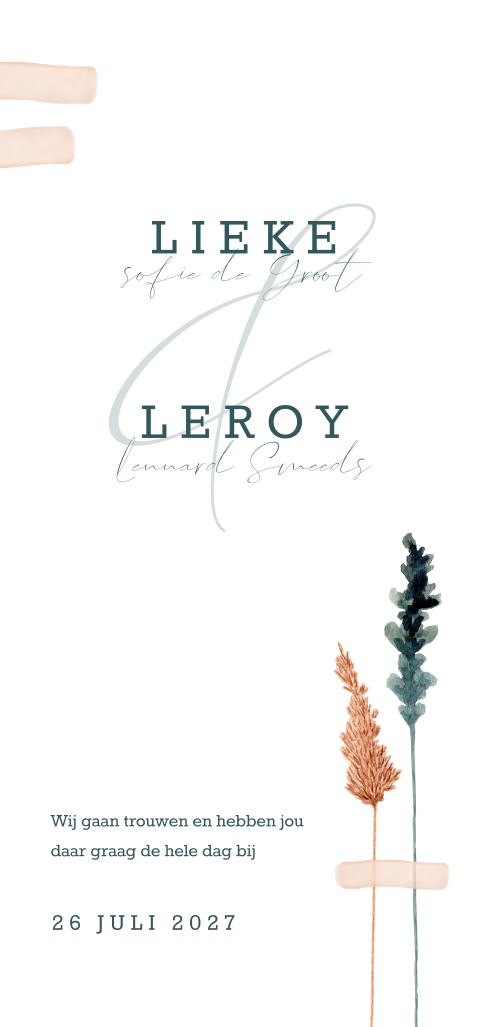 Trouwkaart met droogbloemen, roze waterverf en stijlvolle typografie. Droogbloemen zijn tijdloos en staan prachtig op deze stijlvolle trouwkaart. De typografie steekt mooi af bij de frivole bloemen. In de kaart is voldoende ruimte voor het programma en de overige informatie. Ook kun je nog een persoonlijke boodschap plaatsen.