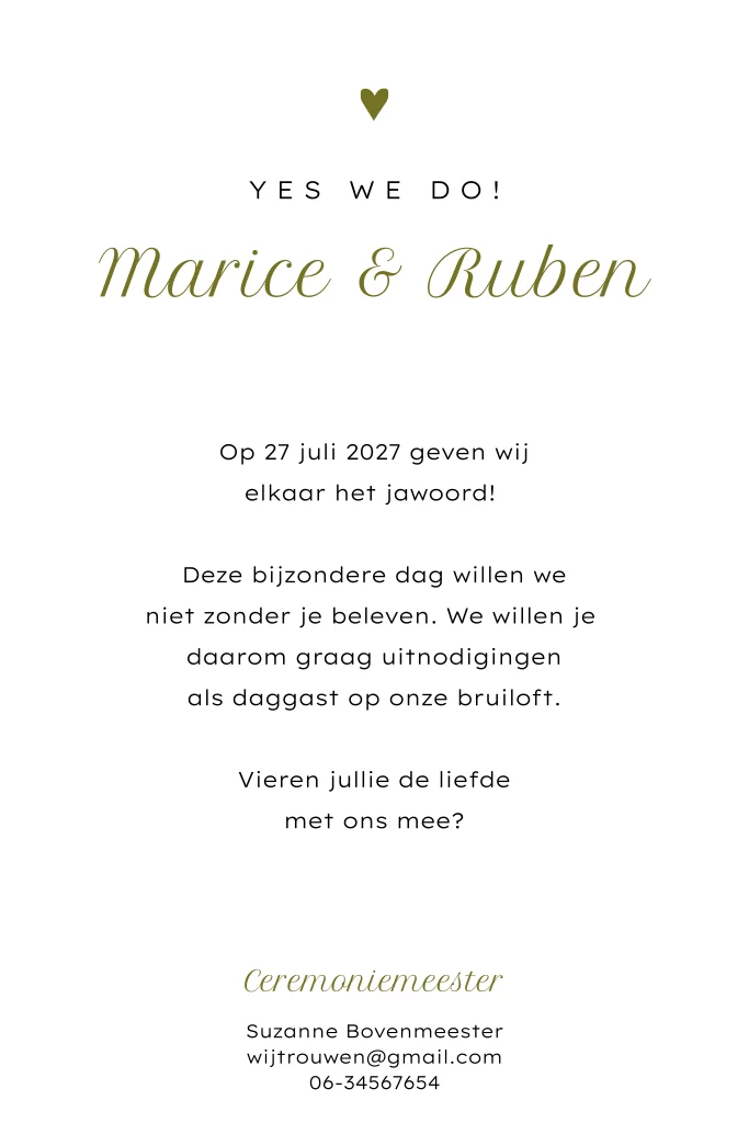 Een zachtgele trouwkaart met boterbloemen, perfect voor een lente- of zomerhuwelijk. Onderaan de kaart staat een strook met wilde gele boterbloemen in een veld, die doorlopen naar de achterzijde. Aan de binnenzijde is er alle ruimte voor een tijdlijn en de uitnodiging. Pas de kaart aan naar wens met de designtool en bestel een drukproef.