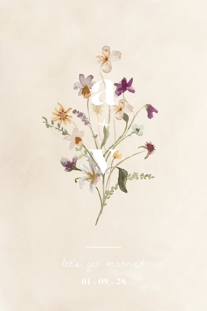 Luxe trouwkaart met een boeket van veldbloemen. Jullie initialen zijn in koperfolie gedrukt. Op de achterkant van deze trouwkaart is ruimte voor verdere informatie over jullie trouwdag. De afgeronde hoeken geven dit kaartje net dat beetje extra. Pas dit ontwerp zelf aan in onze handige editor. Voor nog meer trouwkaarten met bloemen klik hier.