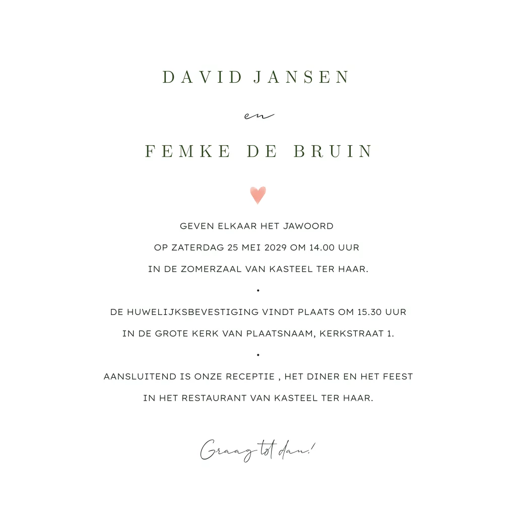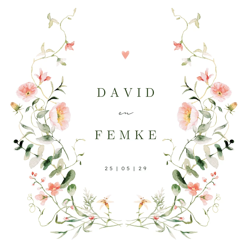 Een romantische trouwkaart met een subtiele bloemetjes in warme, zachte tinten. De symmetrische compositie en minimalistische typografie hebben een moderne uitstraling. De delicate details en het speelse hartje bovenaan maken dit ontwerp perfect voor een stijlvolle huwelijksaankondiging. Pas de kaart eenvoudig aan met de designtool en vraag een drukproef aan.