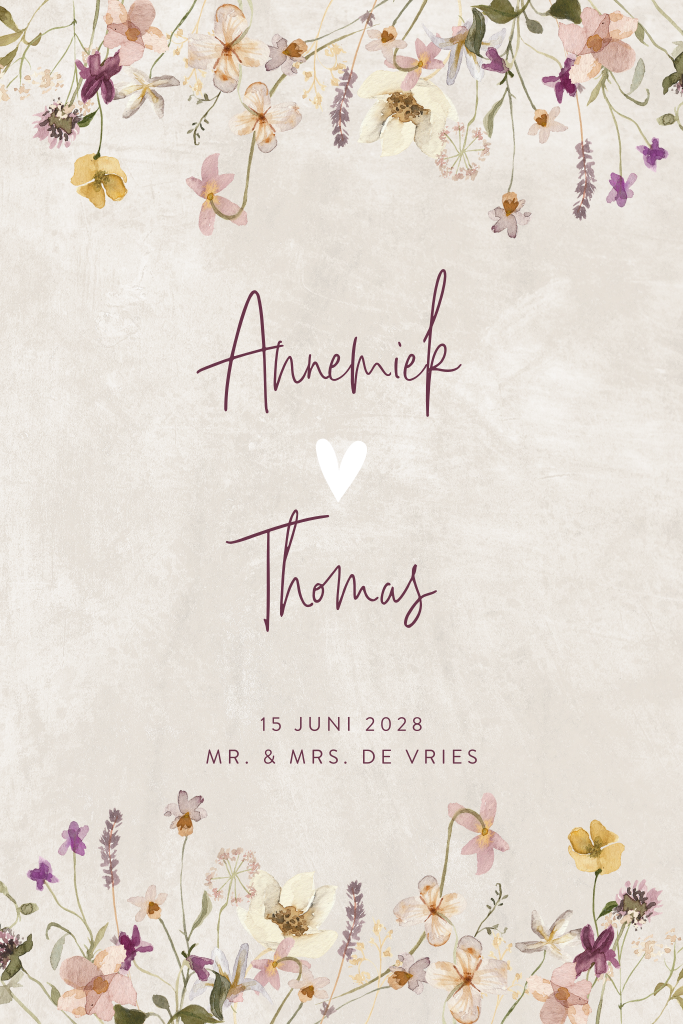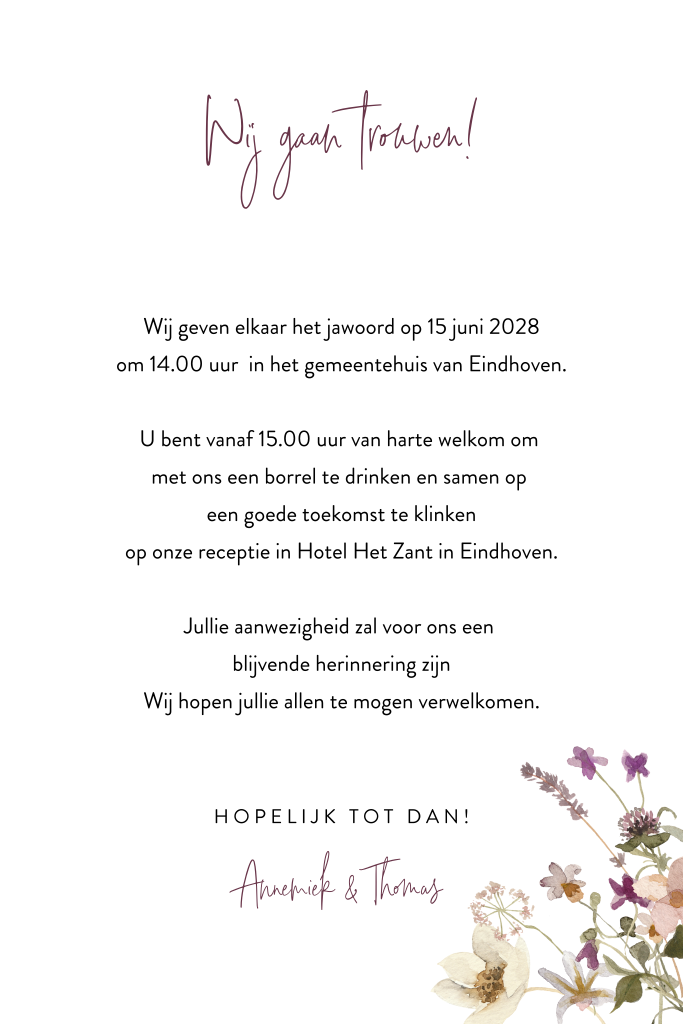 Chique trouwkaart met boven en onder een strook met wilde veldbloemen op een beige ondergrond. Beige is de kleur van nu en in combinatie met deze veldbloemen heb je een extra hip ontwerp. Het goudfolie hartje maakt de kaart helemaal af. Aan de binnenzijde staat alle tekst en komen de foliedruk hartjes terug. Wil je een trouwkaart met wilde veldbloemen? Klik hier voor onze gehele collectie trouwkaarten met bloemen.