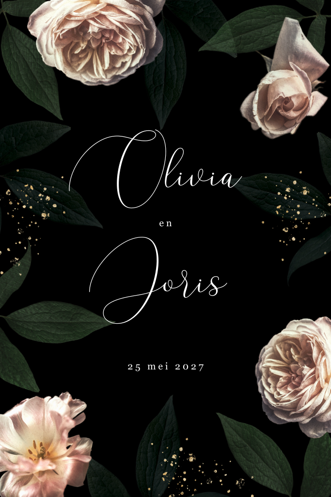 Stijlvolle enkele trouwkaart met tulpen en rozen in roze. Dol op de ouderwetse schilderkunst, boeken en andere vintage snufjes? Dan hebben wij een prachtige trouwkaart voor jou! Dit vintage ontwerp ziet er toch erg modern uit door de combinatie van de zachtroze bloemen, spetters en bladeren. Het vlotte lettertype draagt daar ook aan bij. Je kunt deze kaart makkelijk personaliseren door nog meer bloemen toe te voegen of de lettertypes te veranderen.