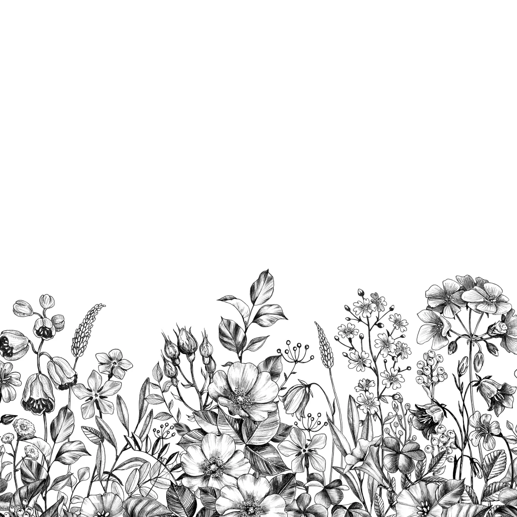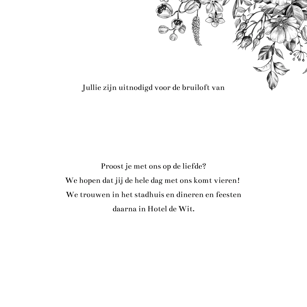 Een mooie trouwkaart met zwart-witte bloemen en goudfolie namen. Een eigentijds ontwerp met prachtige getekende bloemen en glimmend goudfolie. Pas dit ontwerp zelf aan in onze editor. Wijzig bijvoorbeeld de achtergrondkleur of de foliekleur.