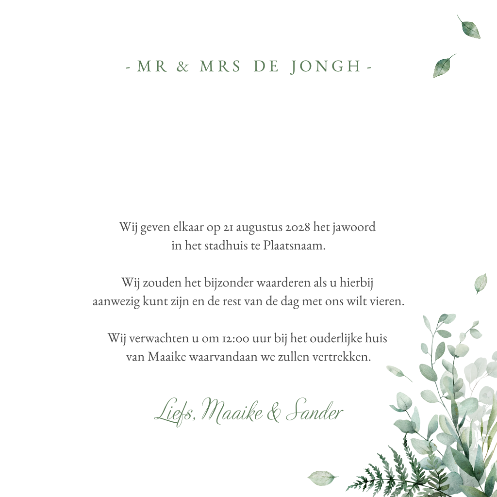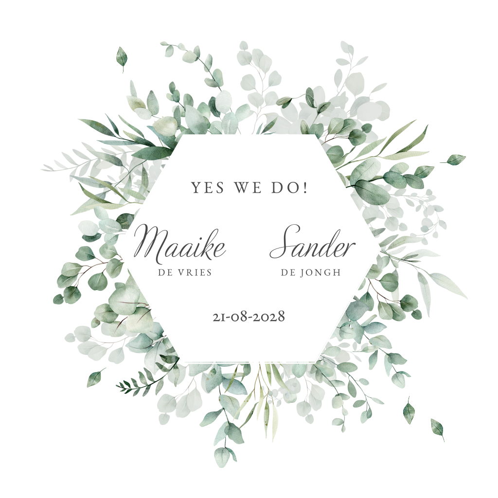 Trouwkaart met heel veel groene bladeren en takjes rondom een zeshoek waarin de namen van het bruidspaar staan. Tussen de bladeren staan gouden hartjes. Je kunt het ontwerp in de editor geheel naar wens aanpassen. Tevreden met je ontwerp? Bestel een drukproef.