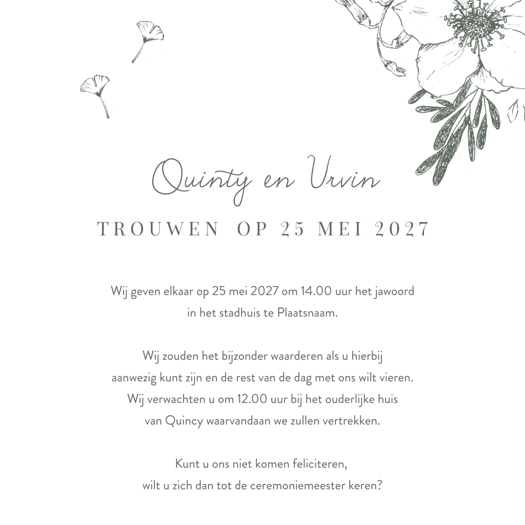 Mooie trouwkaart met donkergroene waterverf als achtergrond. De eerste letter van jullie namen staan als mooie initialen met getekende bloemen voorop de kaart. Voeg je eigen initialen toe door in het mapje 'Cijfers en Letters' te kijken. Tevreden met je aanpassingen? Bestel een drukproef.