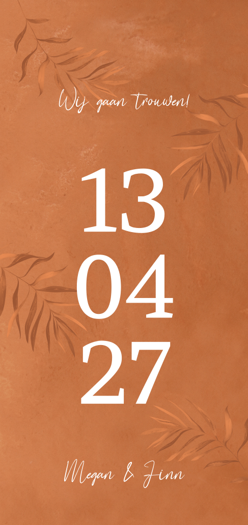 Trouwkaart met oranje waterverf achtergrond en bladeren. Met zijn prachtige warme oranje tinten is deze trouwkaart ontzettend sfeervol. De datum van jullie bruiloft is een echte eyecatcher! De oranje bladeren geven de kaart een botanisch tintje. De achterkant is rustig gehouden en heeft plek voor alle programma gegevens en natuurlijk jullie namen. Maak zelf deze trendy trouwkaart in de designtool, pas de teksten aan en bestel een drukproef.
