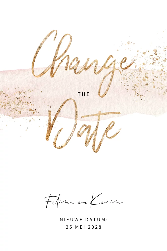 Zijn jullie trouwplannen veranderd en is de nieuwe datum al bekend? Dan wil je natuurlijk wel aan alle gasten laten weten. Stuur ze daarom deze stijlvolle change-the-date kaart met zachtroze waterverf, gouden spetters en mooie typografie in dezelfde stijl als de trouwkaart.