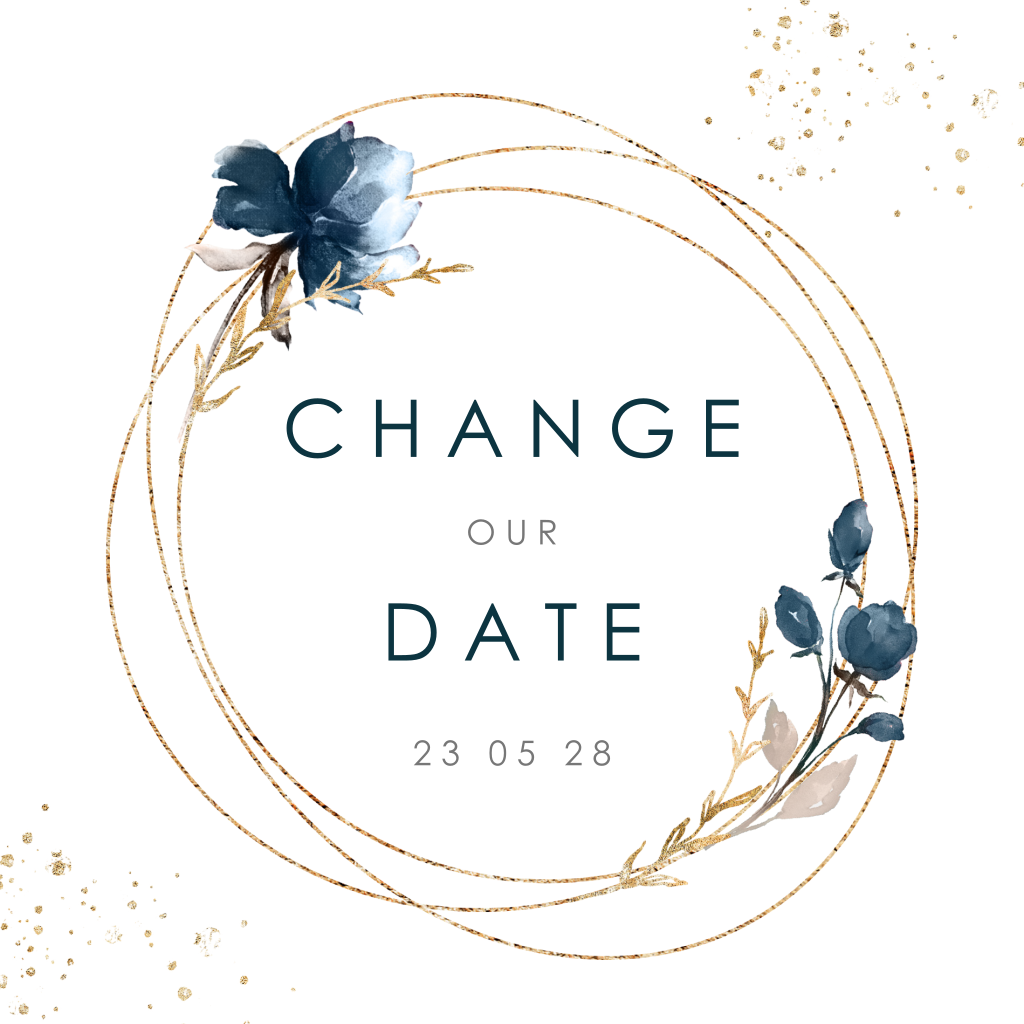 Change the date kaart met gouden cirkel en bloemen. Je bruiloft moeten verzetten wegens omstandigheden is nooit leuk, maar soms is het onvermijdelijk. Stuur dit witte change the date kaartje met goudkleurige cirkel en geschilderde bloemen naar al jouw gasten om ze de nieuwe datum te laten weten. Pas het ontwerp naar wens aan en bestel eventueel een proefdruk.