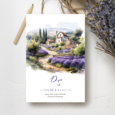 Trouwkaart in waterverfstijl, geïnspireerd door het schilderachtige landschap van de Provence in Frankrijk. Op de kaart staat een rustiek landhuis omringd door uitgestrekte lavendelvelden en cipressen, die perfect de charme en sfeer van de regio weergeven. De zachte paarse tinten van de lavendel steken prachtig af tegen het groen van de natuur en de aardetinten van het landhuis en pad.
