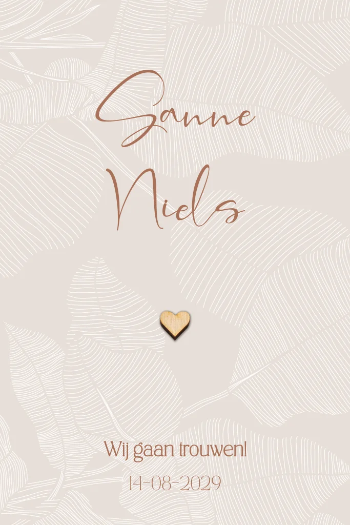 Beige trouwkaart met bladeren en houten hartje