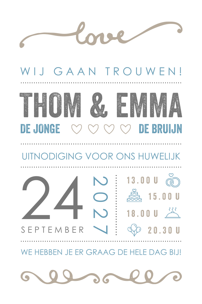 Jullie gaan binnenkort trouwen en zoeken nog een mooie trouwkaart? Misschien is deze enkele trouwkaart met een goed idee. De typografische stijl met icoontjes voor de tijden kun je naar wens aanpassen. Liever een andere kleur? pas alles eenvoudig aan met de ontwerptool.