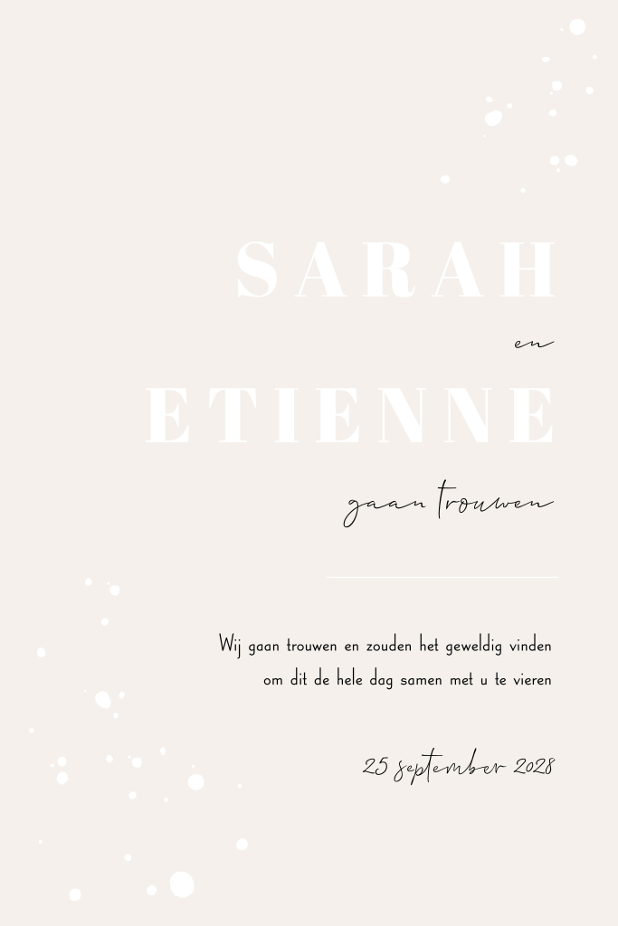Een trendy trouwkaartje met holografische foliedruk! In deze foliekleur zitten allerlei verschillende kleuren en deze combineren prachtig met de zachte, beige tint. De spetters maken dit tot een speels ontwerp. Liever een andere kleur folie of de lettertypes wijzigen? Geef je eigen draai aan deze trouwuitnodiging in onze handige editor.