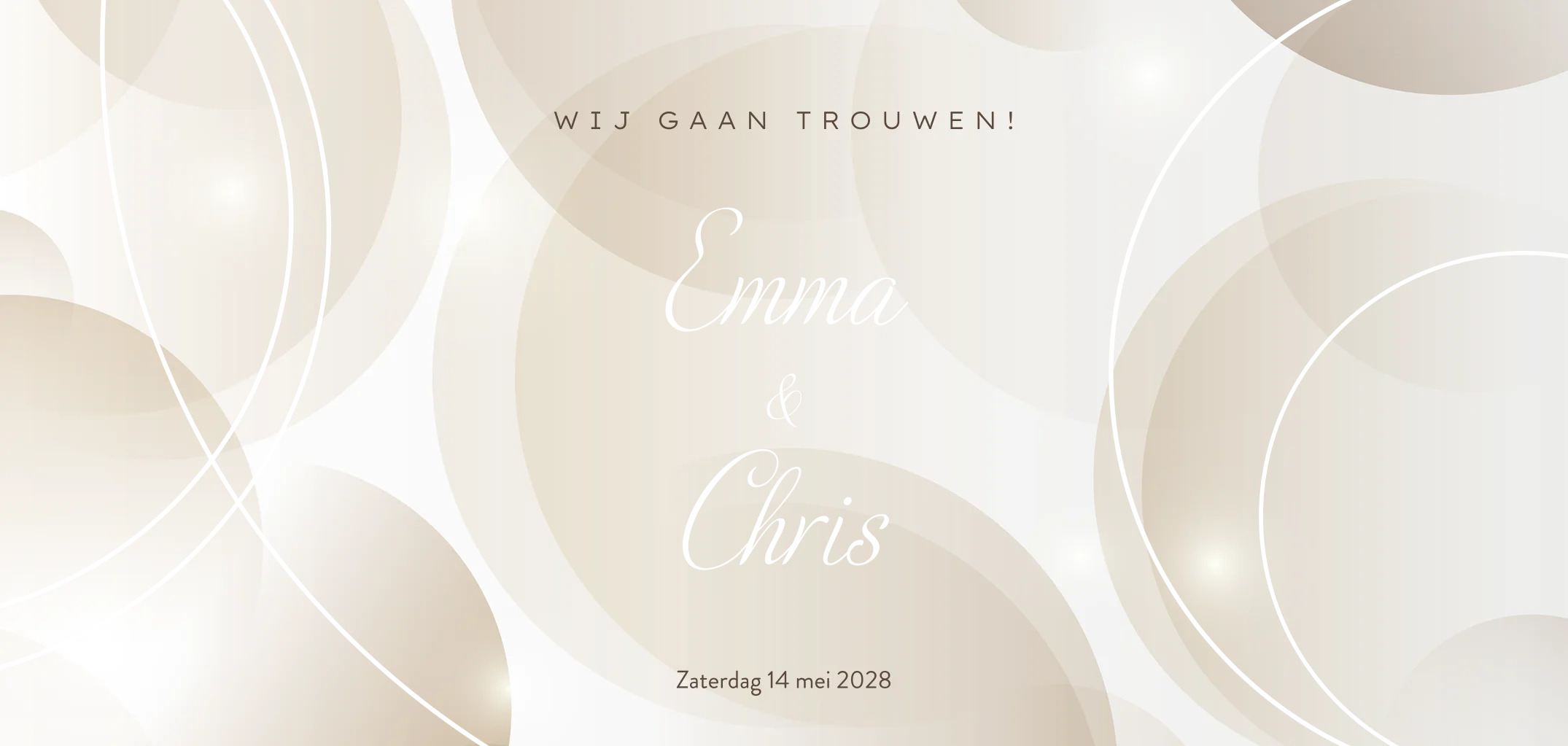 Beige trouwkaart met voorop de namen van het bruidspaar en de cirkels in echt koperfolie. Mooie feestelijke trouwkaart in de trendy kleur beige. Liever zilverfolie of goudfolie? Dit is aan te passen in de editor.