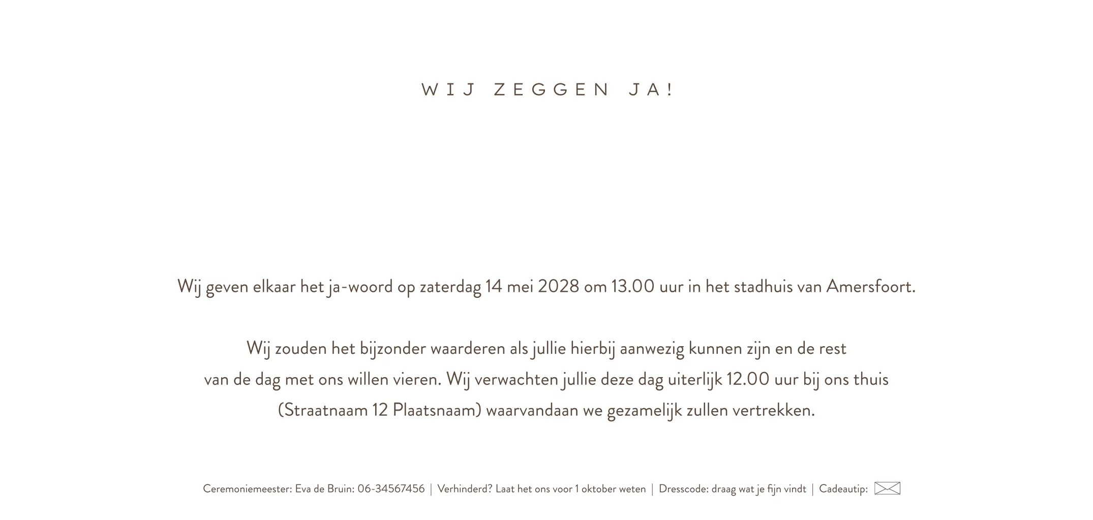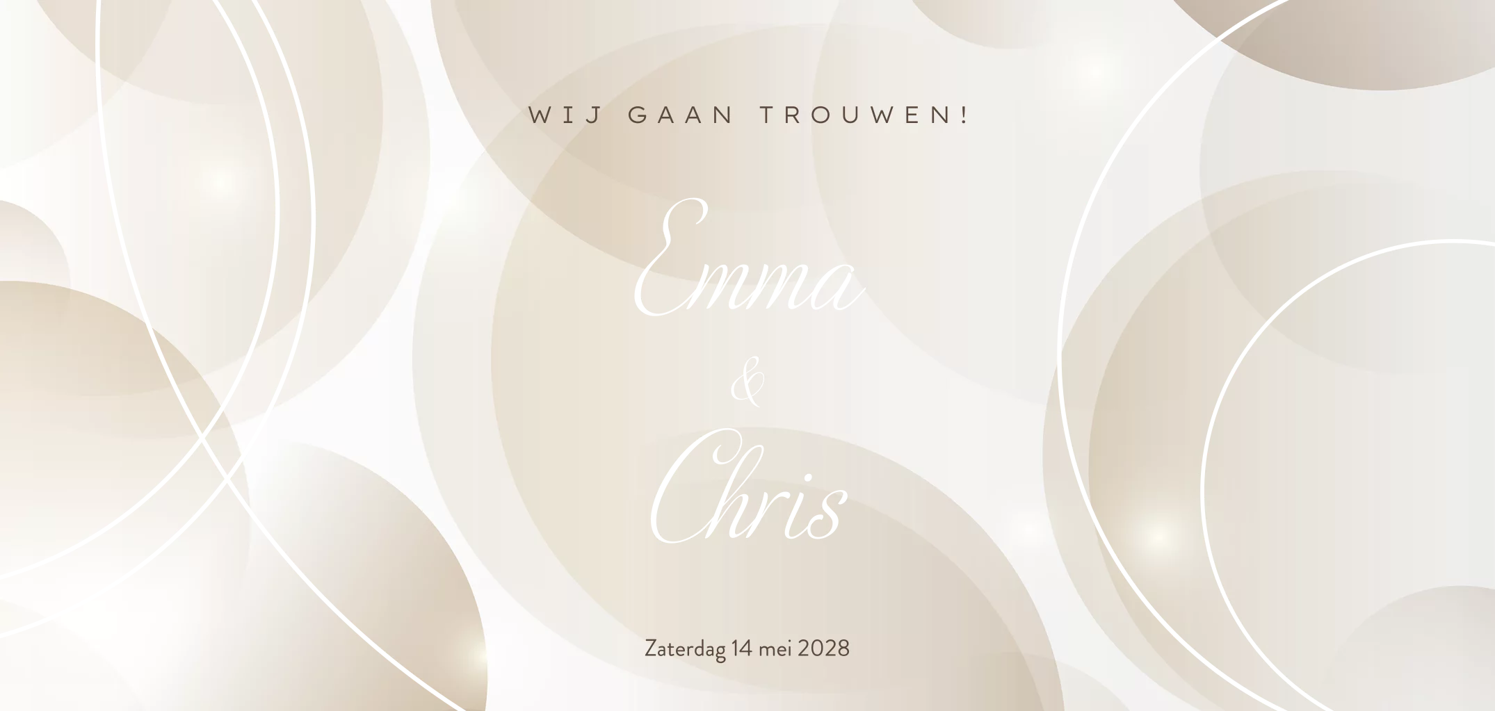 Beige trouwkaart met voorop de namen van het bruidspaar en de cirkels in echt goudfolie. Mooie feestelijke trouwkaart in de trendy kleur beige. Liever zilverfolie of roségoudfolie? Dit is aan te passen in de editor.