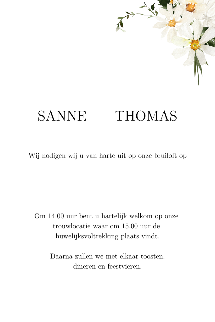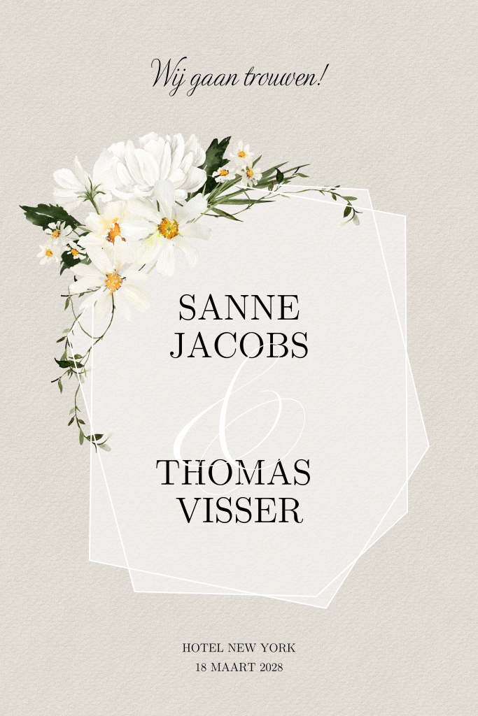 Romantische trouwkaart met witte bloemen (margrietjes) en zwarte initialen. De achtergrond heeft een neutrale kleur waardoor de witte bloemen mooi afsteken. Aan de binnenzijde is genoeg ruimte voor alle informatie over jullie trouwdag. Pas deze trouwkaart zelf aan in onze ontwerptool.