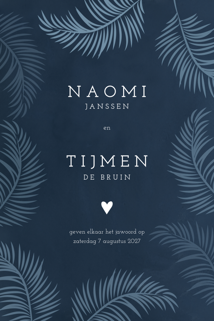 Donkerblauwe trouwkaart met tropische bladeren en namen in goudfolie. Chique trouwkaart met donkerblauwe achtergrond op enkel formaat. De kaart wordt omrand door lichtblauwe tropische bladeren. Voor de finishing touch wordt de typografie met echte goudfolie gedrukt, zo krijgt de kaart een stijlvolle en hippe uitstraling. Achterop de kaart keren de bladeren terug en kun je alle informatie over jullie huwelijksdag.