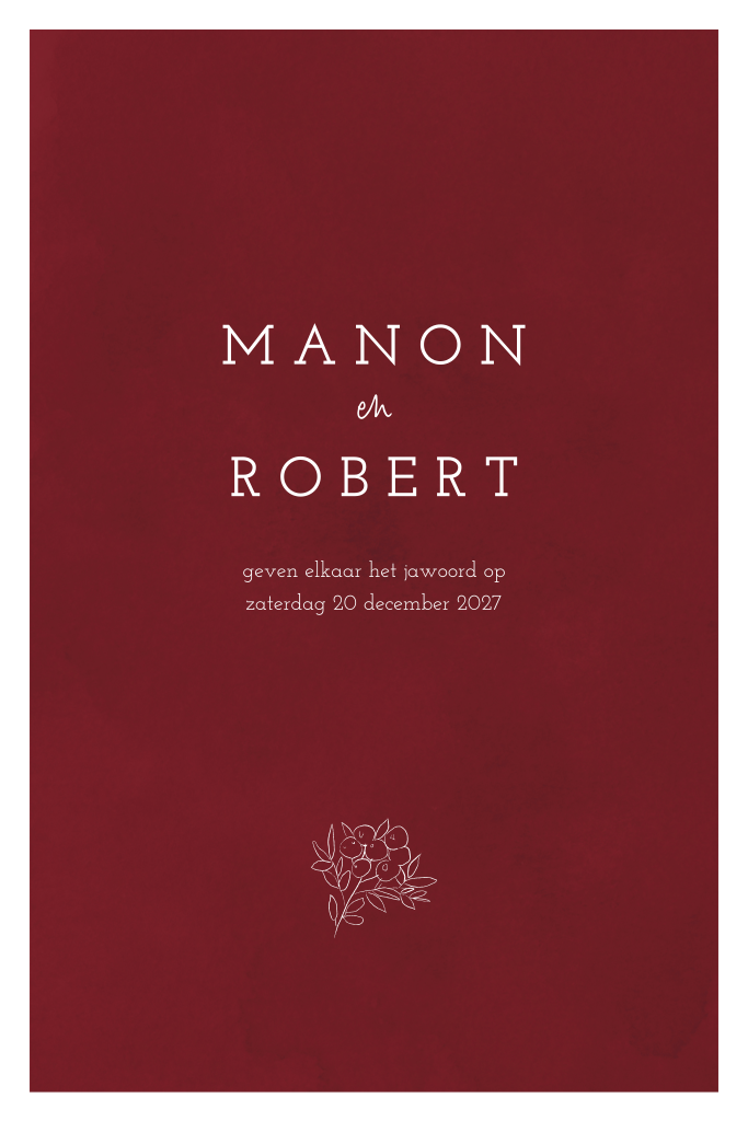Rode trouwkaart met namen in goudfolie en blaadje. Mooie trouwkaart met chique uitstraling. De kaart heeft een wit kader en een donkerrode achtergrond. In het midden staan jullie namen met glanzend goudfolie. Onderaan zie je een wit takje met bessen. Pas het ontwerp naar wens aan in de ontwerptool en bestel een drukproef.