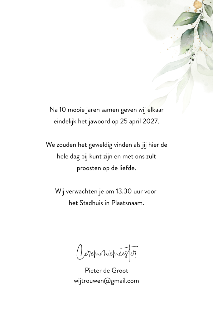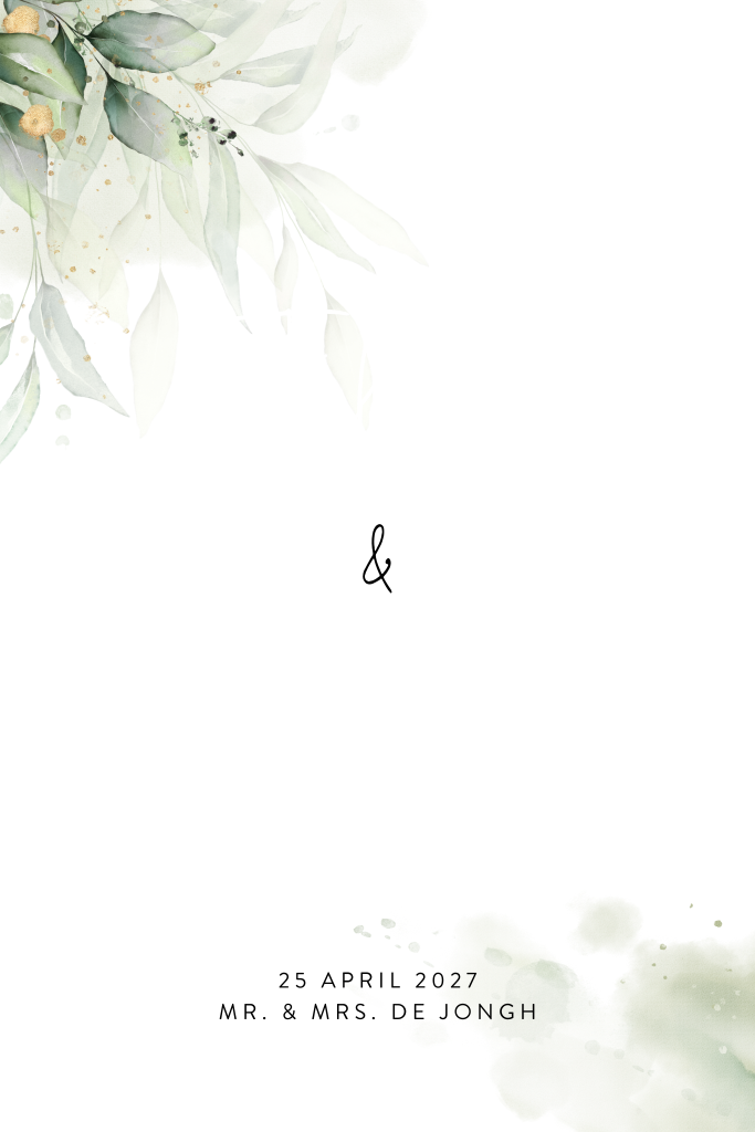 Botanische trouwkaart met waterverf bladeren en namen in goudfolie. Een mooie botanische trouwkaart, perfect voor een bruiloft in een tuin of bos! De groene waterverf vlekken en bladeren geven deze kaart een dromerige uitstraling. De goudfolie namen maken het ontwerp helemaal af en geven dit kaartje net iets extra's. Aan de binnenzijde is er genoeg ruimte voor het dagprogramma en alle extra informatie over je bruiloft. Pas dit ontwerp eventueel aan in onze ontwerptool.