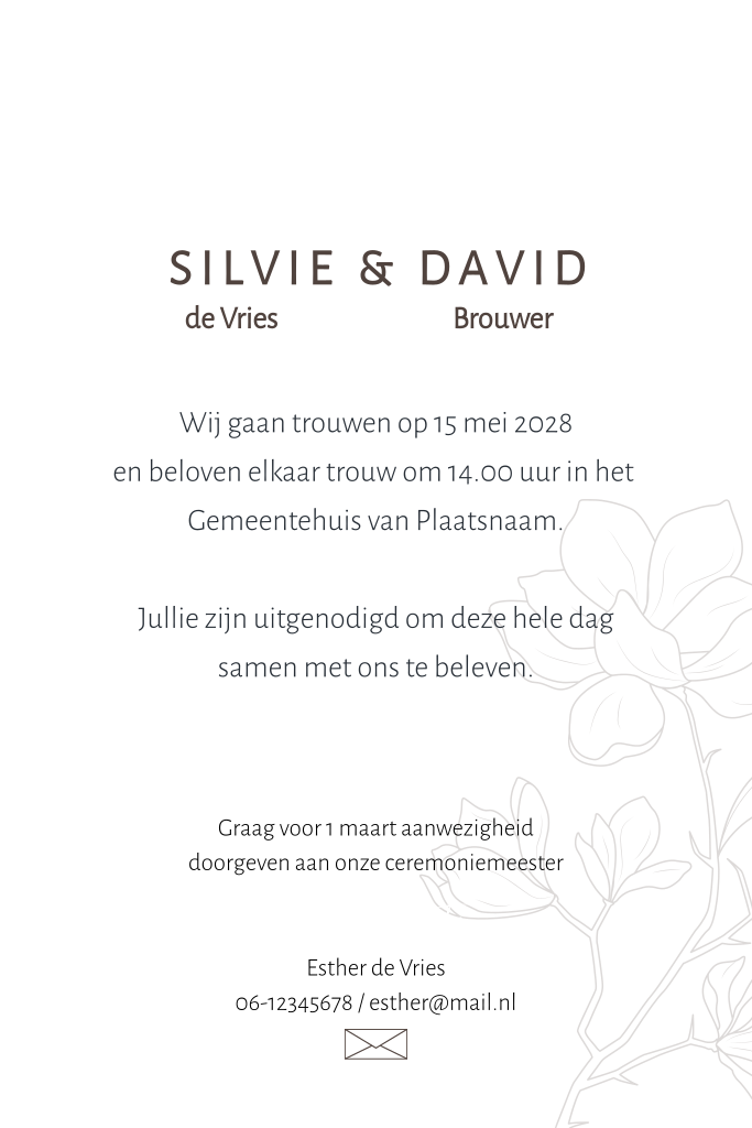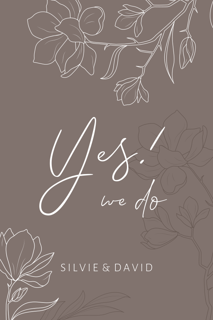 Stijlvolle trouwkaart in bruin met roségoudfolie bloemen. Wil je een andere kleurcombinatie? Pas deze trouwkaart dan eenvoudig aan in onze ontwerptool. Kies een andere kleur achtergrond of voor een andere kleur folie.