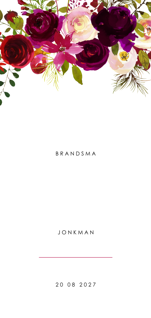 Wil je een trouwkaart volgens de laatste trends? Burgundy bloemen zijn momenteel erg populair. Kies voor deze hippe Burgundy trouwkaart met waterverf bloemen en jullie namen goudfolie om jullie huwelijk aan te kondigen. Mooie witte uitnodiging met paarsrode bloemenin waterverf geschilderd. Op de achterkant kun je alle informatie over de heugelijke dag plaatsen!
