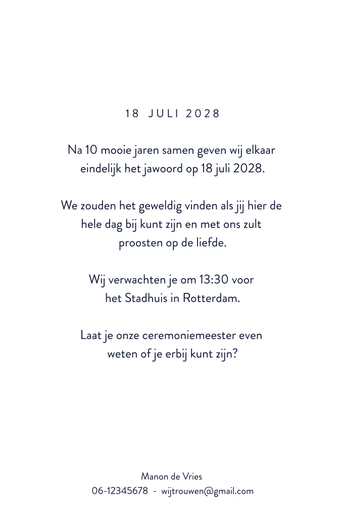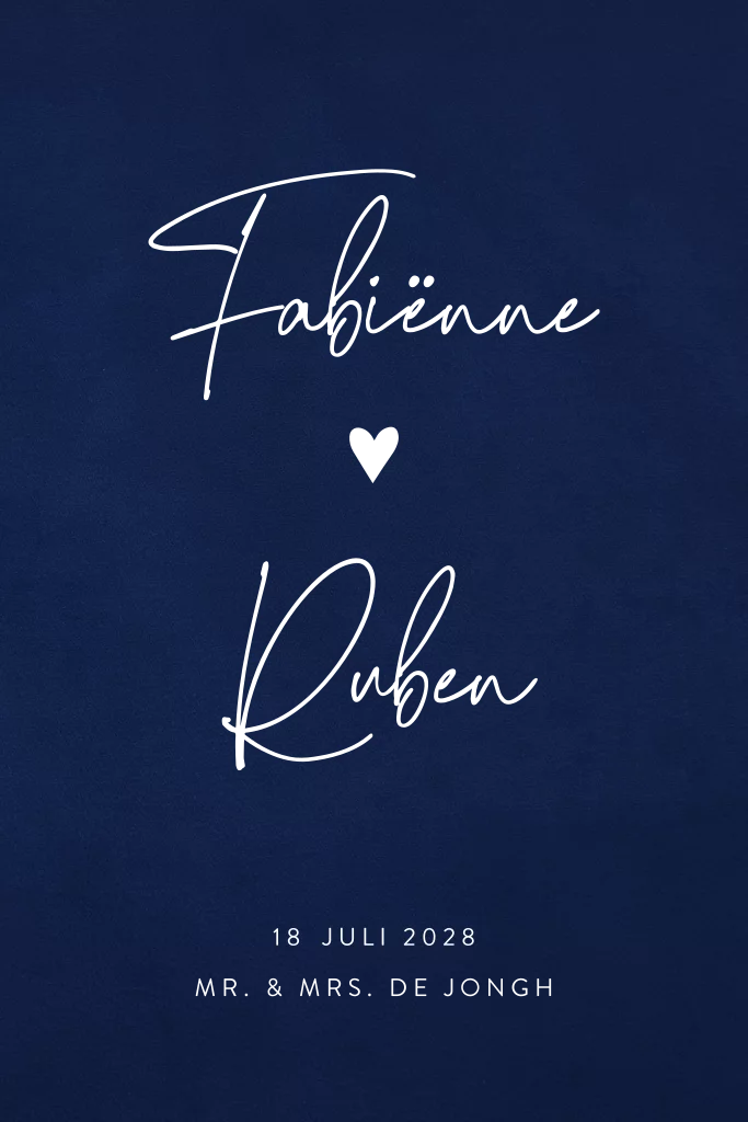 Less is more. Dat geldt bij deze stijlvolle trouwkaart met donkerblauwe achtergrond. Deze kaart heeft namelijk niet veel meer nodig dan een prachtig lettertype voor jullie namen. Om de kaart nog meer shine te geven is de typografie op de voorzijde met roségoudfolie. In de kaart is ruimte voor het dagprogramma en de overige informatie. Blauw niet jouw kleur? Geen probleem, in de ontwerptool pas je de tekst helemaal naar wens aan.