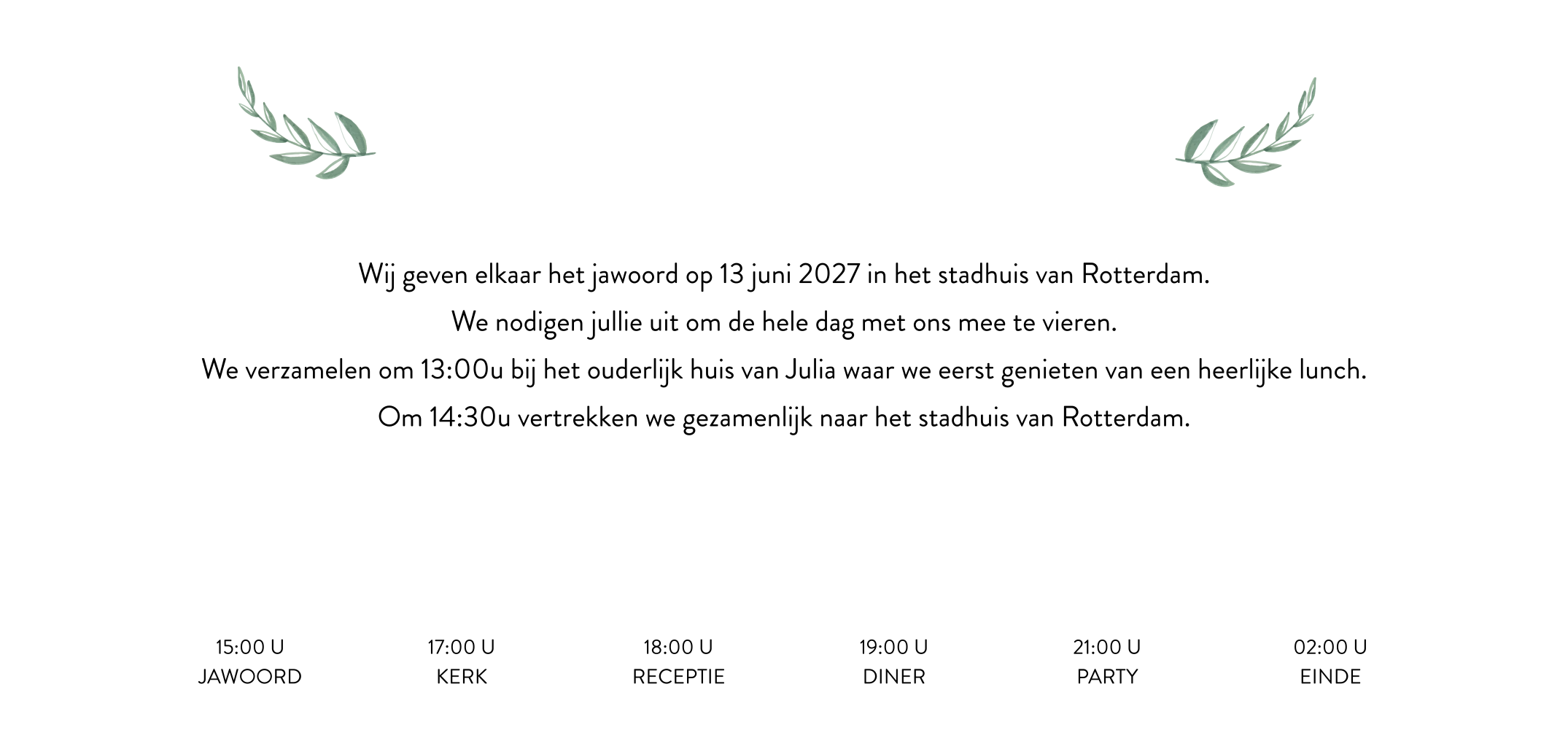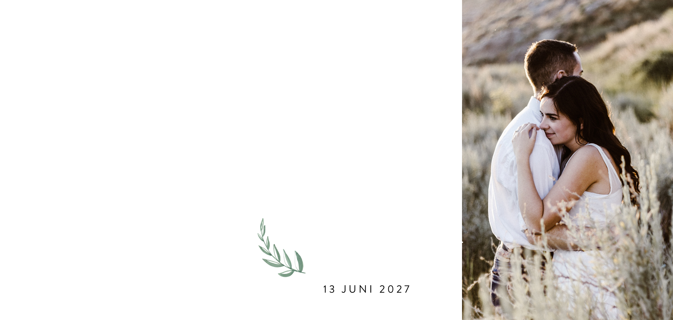 Minimalistische fototrouwkaart met blaadje en namen in goudfolie. Prachtige minimalistische trouwkaart met sierlijk font en mooie foto. Extra bijzonder, dit ontwerp heeft echte goudfolie voorop de kaart. Jullie namen springen extra in het oog door het glanzende effect. Het blaadje, geschilderd met waterverf, maakt het ontwerp helemaal af. In de kaart staat een tijdlijn met mooie iconen, zo weten je gasten precies hoe de dag gaat verlopen. Nieuwsgierig naar deze kaart? Bestel een drukproef.