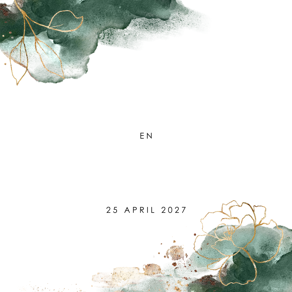 Goudfolie trouwkaart met getekende bloemen en groene waterverf. Een mooie, chique trouwkaart met waterverf vlekken in een diepgroene kleur, getekende bloemen en blaadjes en goudfolie typgrafie. Doordat jullie namen en de bloemen in glimmend goud worden gedrukt krijgt deze kaart een feestelijke en unieke uitstraling. Bekijk ook eens onze blauwe variant van dit ontwerp of pas dit kaartje eventueel aan in onze ontwerptool.
