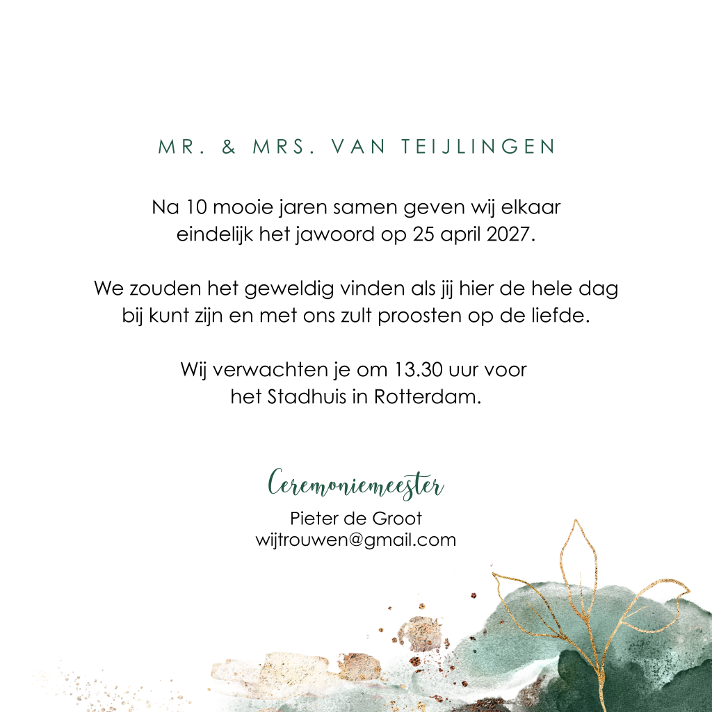 Goudfolie trouwkaart met groene waterverf en bloemen