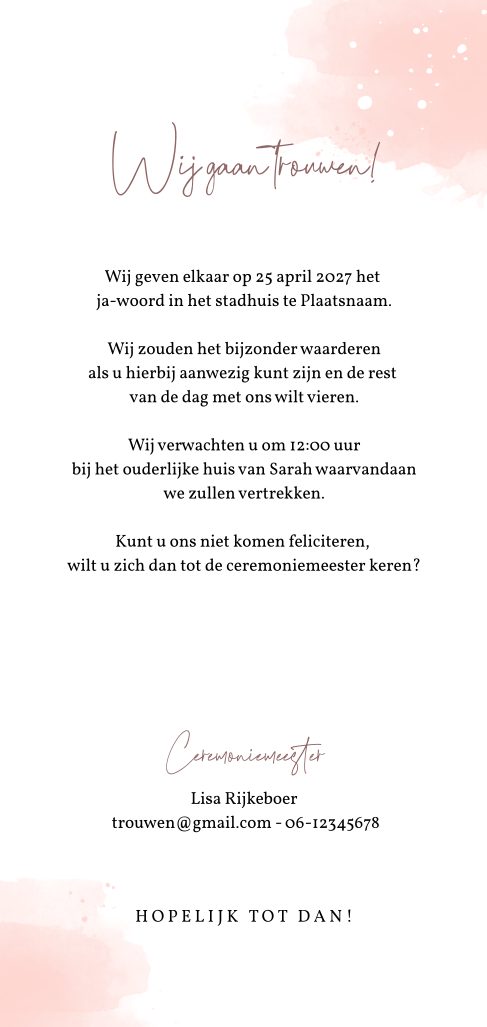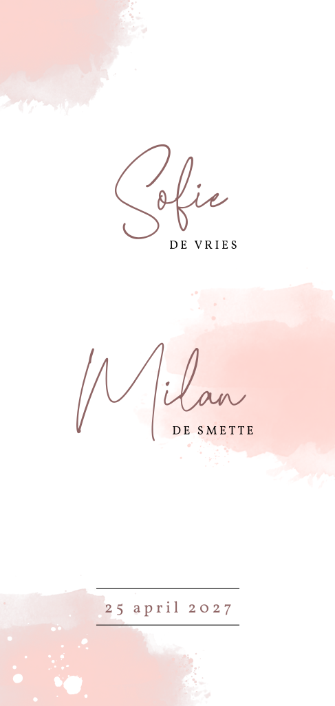 Ben je ten huwelijk gevraagd en op zoek naar een passende trouwkaart? Deze hippe trouwkaart met roze waterverf en goudfolie spetters is helemaal van nu. Deze stijlvolle trouwkaart wordt extra chique door het gebruik van foliedruk. Heb je liever een andere kleur folie? pas deze dan zelf aan in de ontwerptool, je kunt ook de roze waterverf vlekken van kleur wijzigen. Bestel een drukproef om de kaart eerst in je handen te houden.