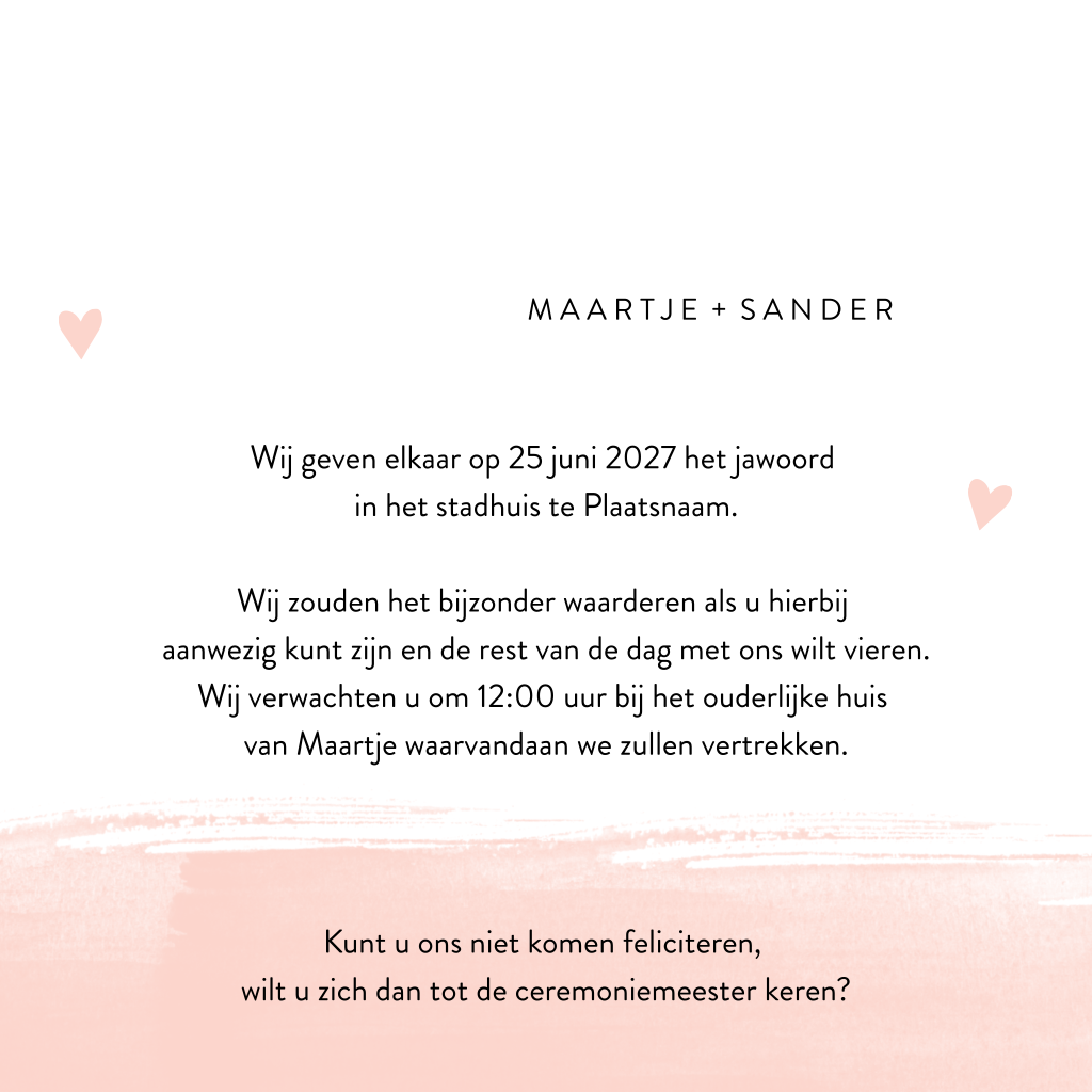 Romantische goudfolie trouwkaart met roze waterverf en stipjes. Een mooie trouwkaart met roze waterverf achtergrond, goudfolie stipjes en roze hartjes. Op de voorkant van de kaart staat in speelse goudfolie letters 'We do'. De gouden stipjes en roze hartjes maken dit een speels en vrolijk ontwerp. Aan de binnenkant van deze dubbele kaart komt de roze waterverf terug en is er genoeg ruimte voor alle info over je trouwdag. Liever een andere kleur? Je kunt de waterverf en de elementen van deze kaart gemakkelijk omkleuren in de ontwerptool, zo wordt jullie trouwkaart nog persoonlijker.