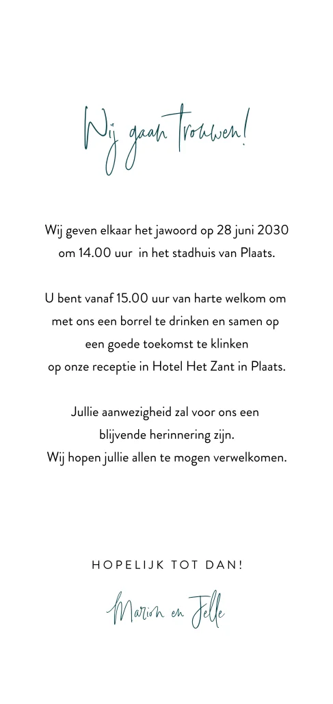 Groene trouwkaart met lijntekening van roze in koperfolie. Houden jullie van bloemen? Dan is deze uitnodiging voor jullie huwelijk ideaal. De koperfolie bloemen spatten van het papier af. Binnenin de kaart is er een ruimte voor het dagprogramma en alle overige gegevens.