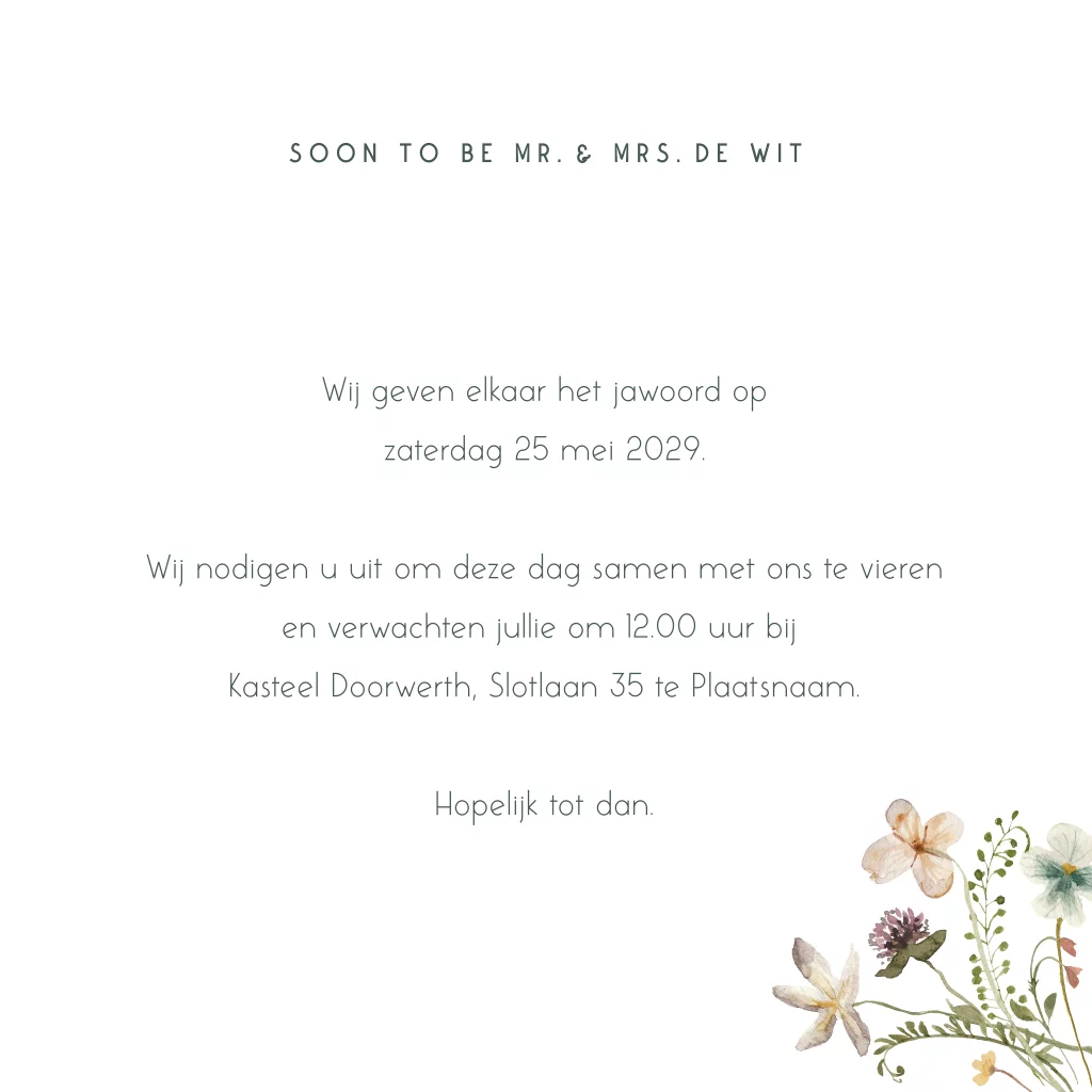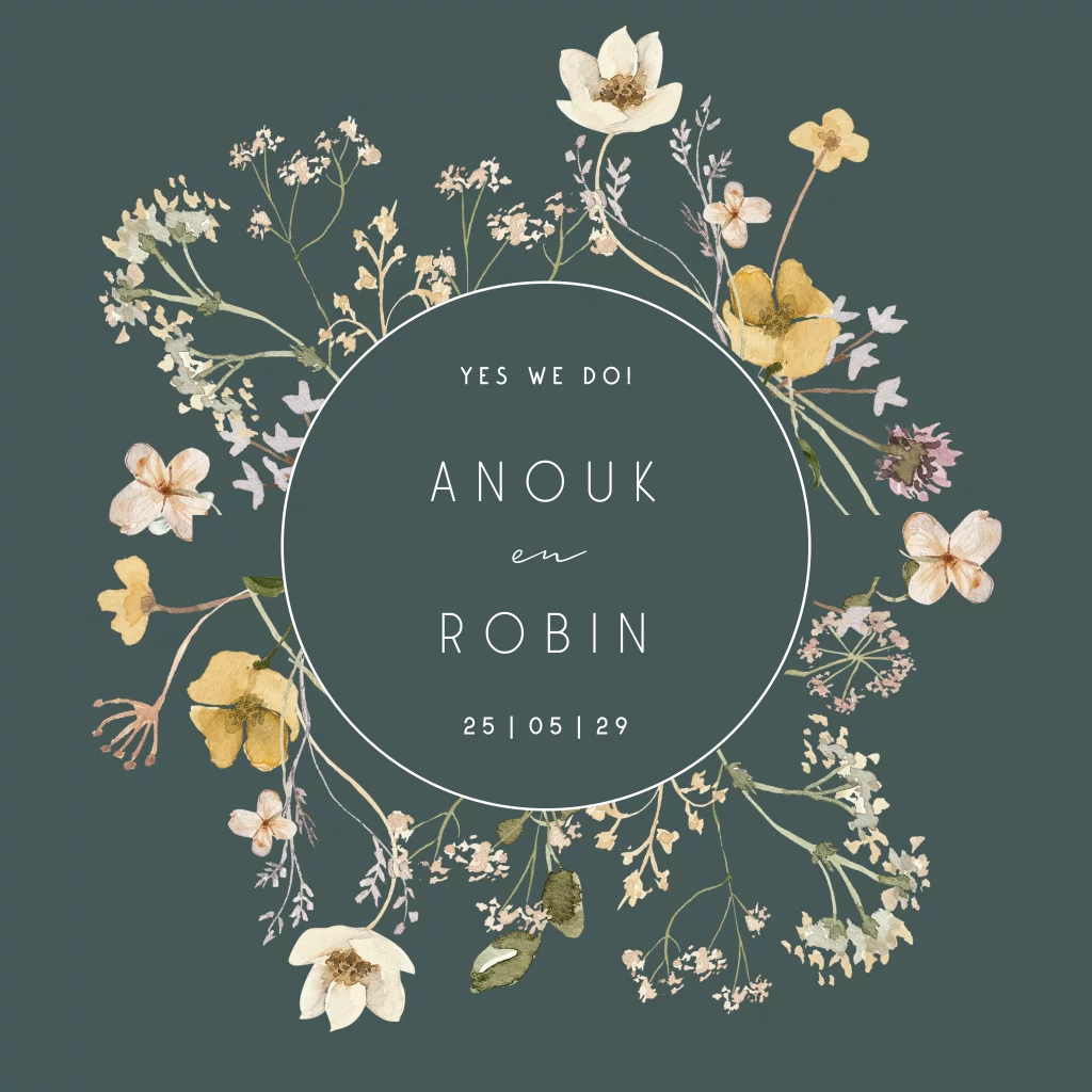 Elegante trouwuitnodiging versierd met weelderige wilde bloemen die een cirkel vormen. Binnenin de cirkel bevinden zich jullie namen en de datum van de bruiloft. De charmante wilde bloemen herhalen zich subtiel in de hoeken aan de binnenzijde van de kaart. Pas deze uitnodiging moeiteloos aan met de editor en creëer een persoonlijke kaart die perfect aansluit bij jullie wensen.