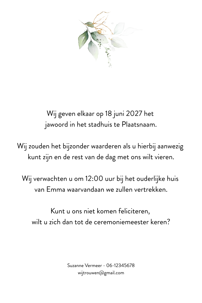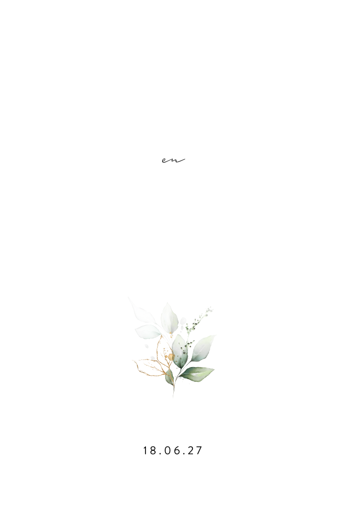 Stijlvolle trouwkaart met enkel groen blad en jullie namen in goudfolie. Passen de woorden klassiek en tijdloos bij jou? Dan is deze chique trouwkaart het ontwerp voor jullie huwelijk. De witte kaart heeft enkel jullie namen en een subtiel blaadje op de voorzijde. Doordat de initialen met goudfolie zijn gedrukt, krijgt de kaart een prachtige uitstraling en extra 'shine'. In de kaart is ruimte voor het dagprogramma. Benieuwd naar deze kaart? Bestel een proefdruk met jullie namen erop.