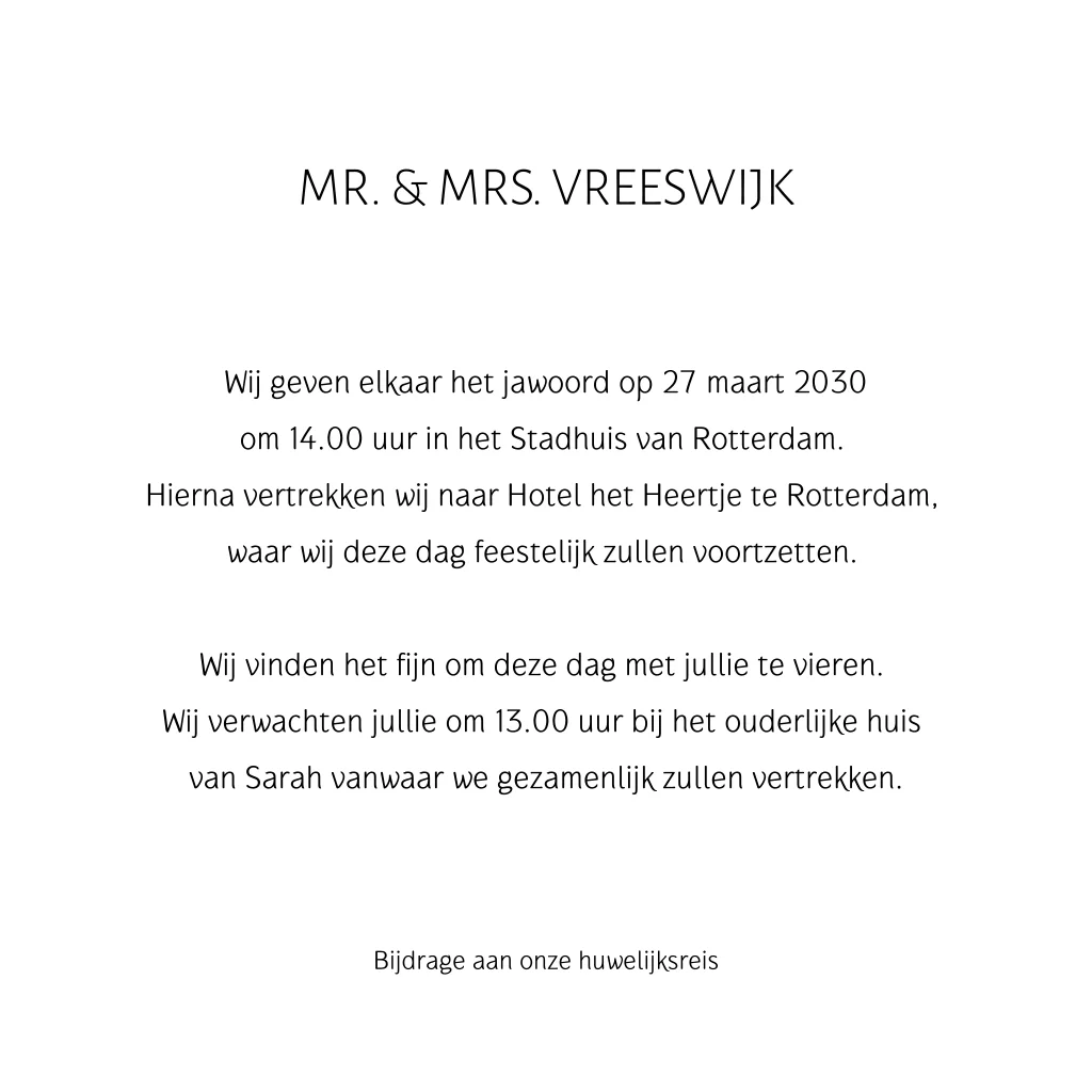 Ben je op zoek naar een stoere en minimalistische trouwkaart? Dan is dit hippe ontwerp misschien wel iets voor jullie bruiloft. Deze witte kaart is versierd met een slinger van lampjes. Zowel de tekst als lampjes worden gedrukt met koperfolie. Liever zilver- of goudfolie? Dat is natuurlijk ook mogelijk. Pas het ontwerp naar wens aan in de ontwerptool.