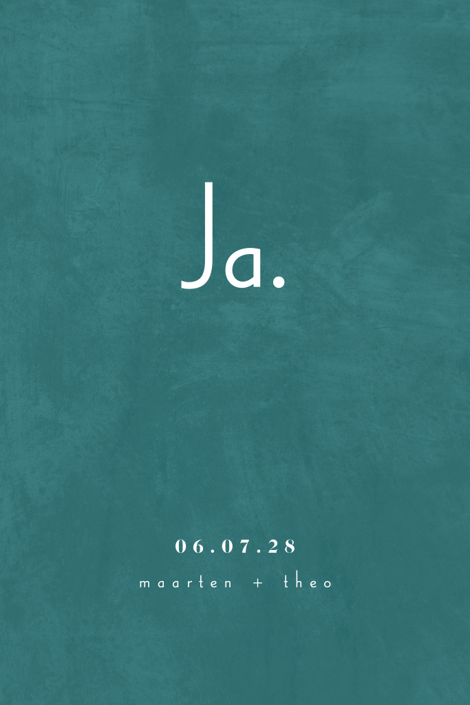 Een enkele trouwkaart met afgeronde hoeken, teal achtergrond en goudfolie typografie. Een minimalistisch en stijlvol ontwerp. Pas deze trouwuitnodiging zelf aan naar eigen wens en bestel een proefdruk om deze kaart in het echt te bewonderen.