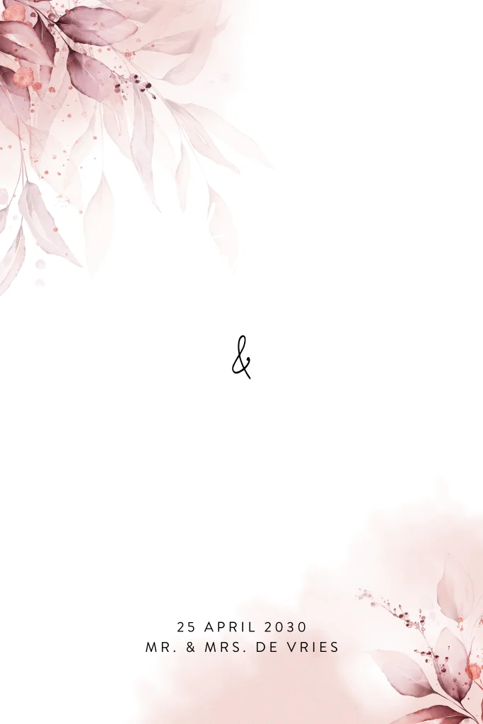 Een prachtige, botanische trouwkaart met koperfolie typografie en roze waterverf illustraties. Een dromerig en romantisch ontwerp voor jullie aanstaande bruiloft! De roze tinten passen heel mooi bij de koperfolie typografie. Toch liever een andere kleur folie? Pas de foliekleur zelf aan in onze ontwerptool. Ook de lettertypes en teksten kun je aanpassen in onze editor.
