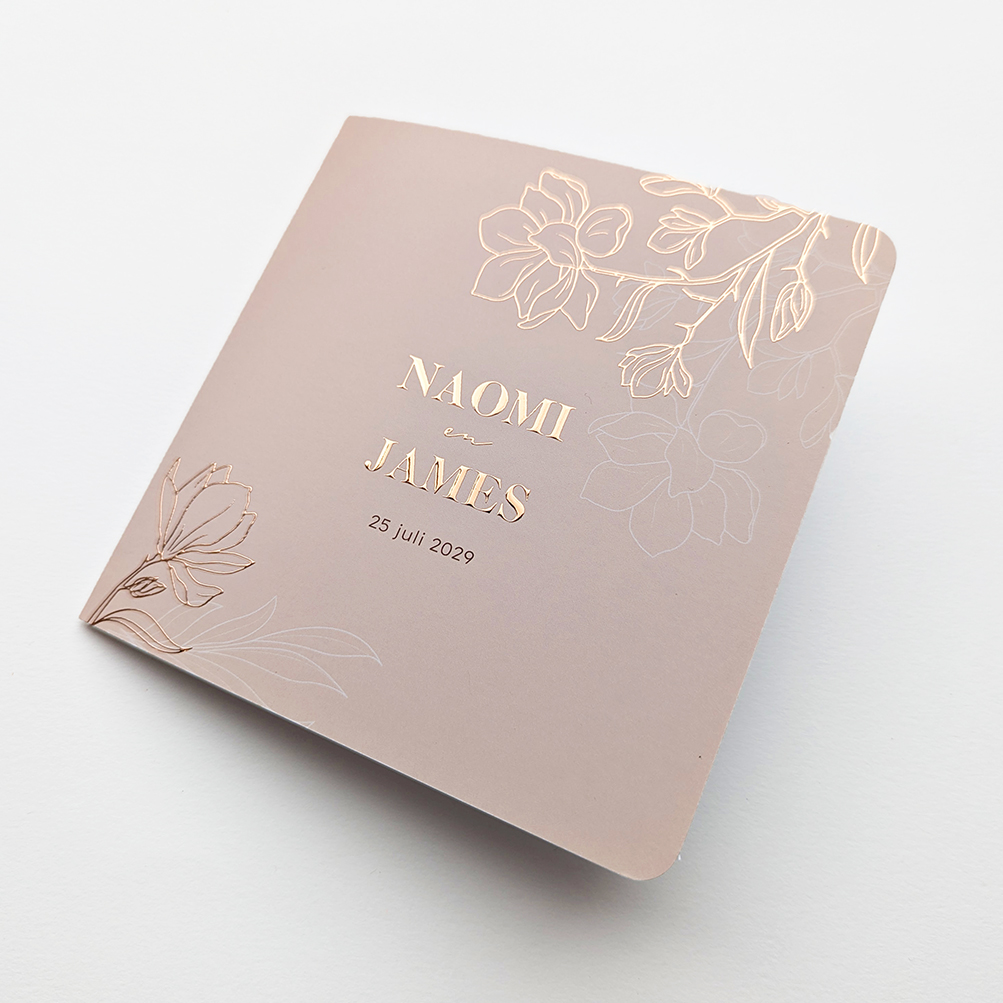 Ontdek onze prachtige trouwkaart, gekenmerkt door een roze achtergrond en schitterende roségoudfolie bloemen. Deze tijdloze uitnodiging straalt elegantie en romantiek uit, perfect voor jullie trouwdag. Pas eenvoudig aan naar jouw voorkeur met onze editor, of kies een andere foliekleur die past bij jullie stijl.