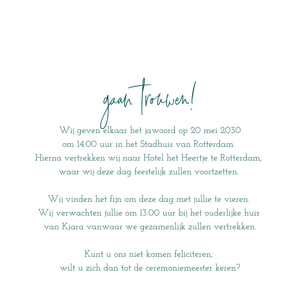 Smaragd groene trouwkaart met koperfolie naam, spetters en hartje. Ben jij op zoek naar een hippe trouwkaart voor jullie huwelijk. Deze kaart is helemaal van nu met waterverf in de trendkleur zeegroen. Dit matcht extra mooi met de koperfolie spetters en hartjes op de kaart. Jullie namen staan in een strak lettertype. In de kaart is voldoende ruimte voor het dagprogramma en een persoonlijke boodschap. Pas het ontwerp naar wens aan in de ontwerptool. Tip van ons, ook met goud- of roségoudfolie is deze kaart heel erg mooi.