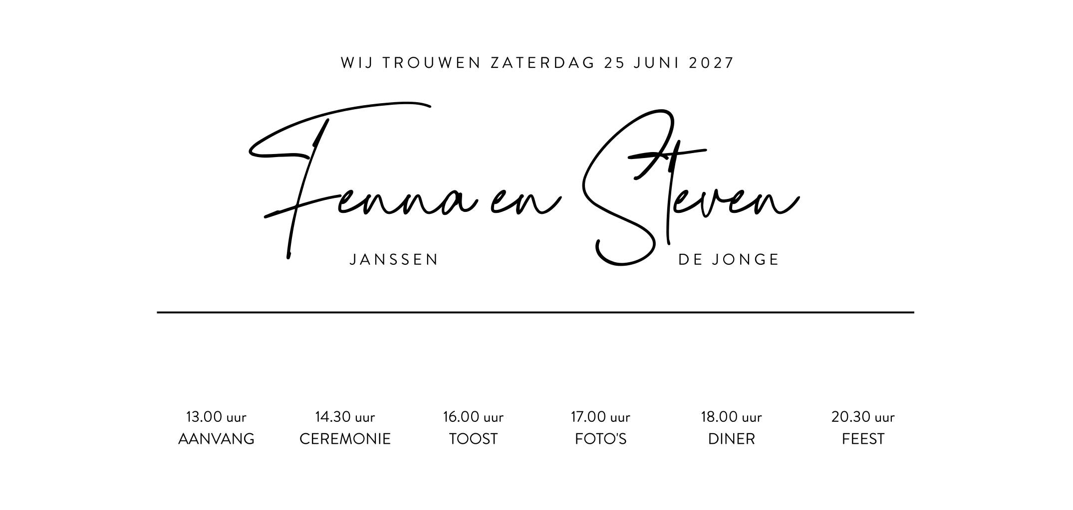 Ben je op zoek naar een stijlvolle trouwkaart om jullie huwelijk aan te kondigen? Deze chique trouwkaart met tijdlijn in gouden icoontjes is dan een goede keuze. Jouw gasten zien in een oogopslag wat het programma van jullie heugelijke dag is. Op de achterzijde kun je alle overige informatie plaatsen. Wil je een andere kleur folie? Dit kan je eenvoudig aanpassen in de ontwerptool.