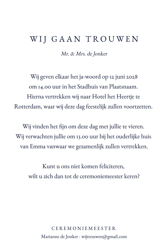 Het 'met minder meer' effect is zeker van toepassing op deze stijlvolle trouwkaart. Deze witte kaart heeft een subtiel blaadje in roségoudfolie in de hoek. Met een chique lettertype staan jullie namen voorop de kaart. In de kaart is ruimte voor het dagprogramma en alle overige informatie. Tip, deze kaart is extra mooi op structuurpapier.