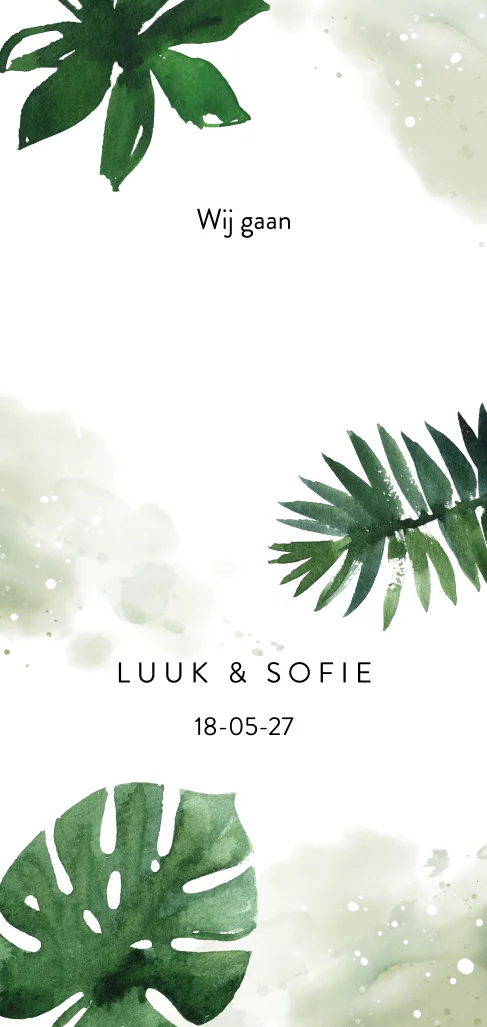 Trouwen in een groene omgeving? Dan past deze botanische trouwkaart met grote tropische bladeren perfect bij jullie trouwdag. Pas de kaart eenvoudig aan met de designtool en bestel een drukproef.