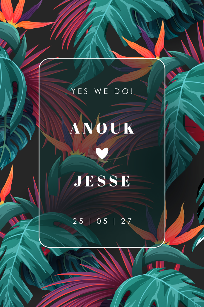 Geven jullie elkaar binnenkort het jawoord? Nodig je gasten voor jullie huwelijk uit met deze tropische trouwkaart met grote bloemen op een zwarte achtergrond. Het kader en de namen van het bruidspaar worden gedrukt in echt roségoudfolie en spat van het papier af. Je kunt de kaart eenvoudig aanpassen in de designtool.