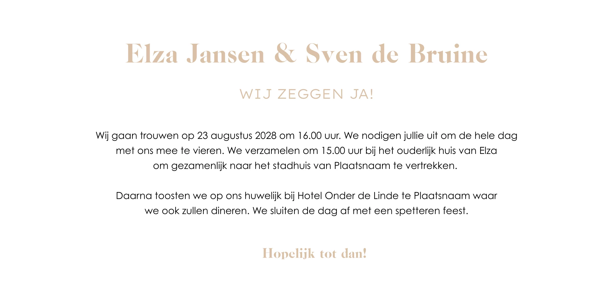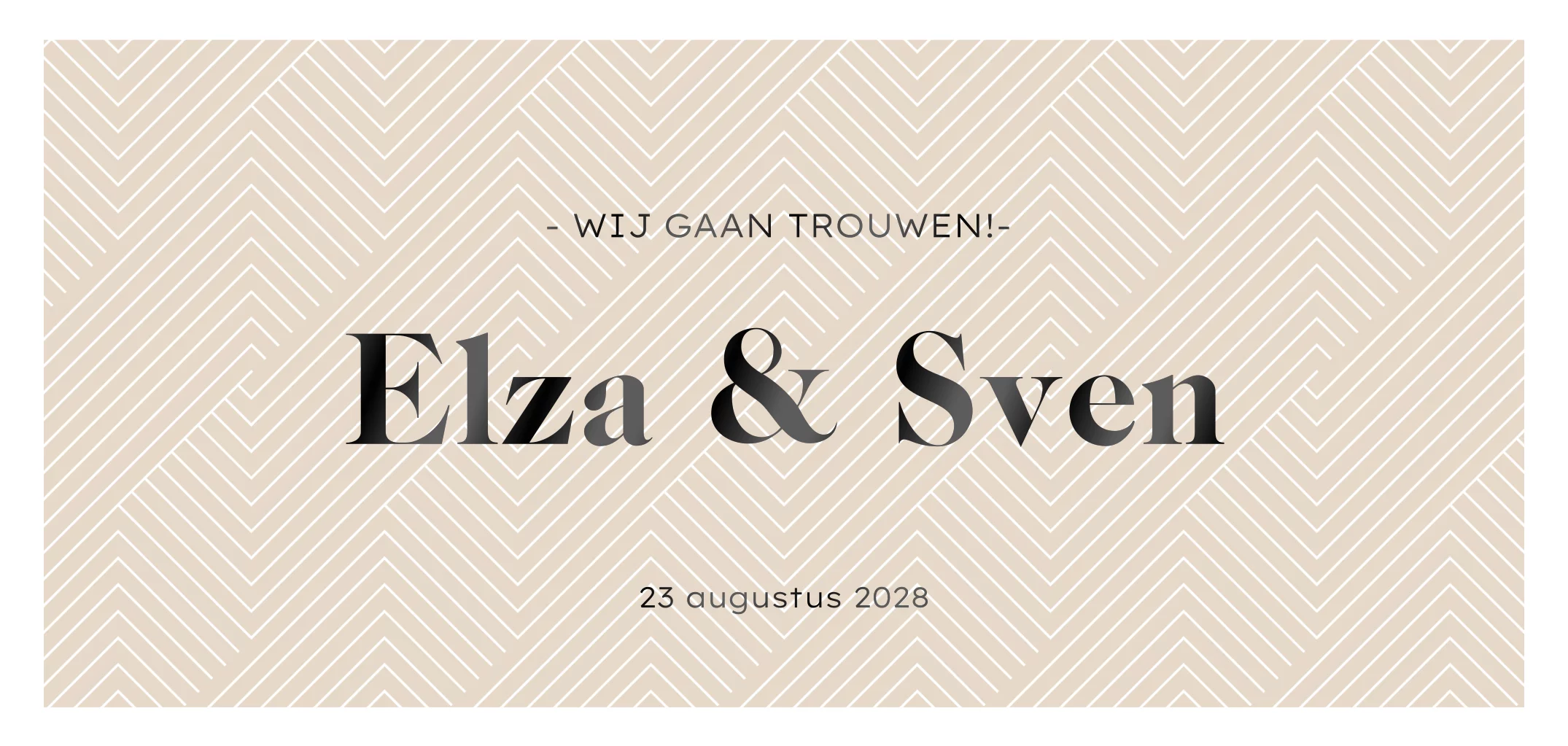 Basic trouwkaart met de tekst aan de voorzijde in hoogglans zwart. Op de beige achtergrond komt het grafische patroon extra mooi uit. Het lettertype van de namen van het bruidspaar bepaald mede de uitstraling van deze trouwkaart, maar is gemakkelijk om te zetten naar een ander lettertype in de editor.