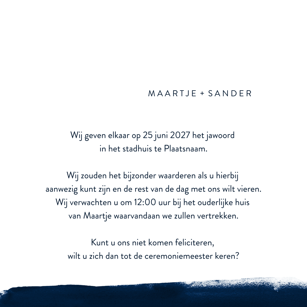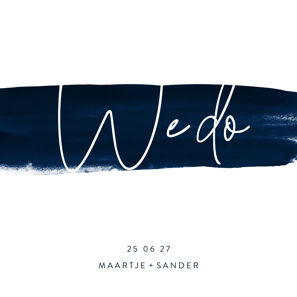 Stijlvolle trouwkaart met donkerblauwe waterverf veeg en typografie in goudfolie. Ben je op zoek naar een stijlvolle trouwkaart met een chique uitstraling? Ga dan voor dit vierkante ontwerp met goudfolie typografie, hartjes en donkerblauwe waterverf! De goudfolie geeft dit ontwerp net iets extra's. Zeker in combinatie met de donkere achtergrond komt het goud goed tot zijn recht. Aan de binnenkant van de kaart komt de blauwe kleur en het speelse lettertype terug. Liever een strak lettertype? Pas dit kaartje gemakkelijk aan in onze ontwerptool. Bestel eventueel een proefdruk om deze mooie kaart in het echt te kunnen bekijken.