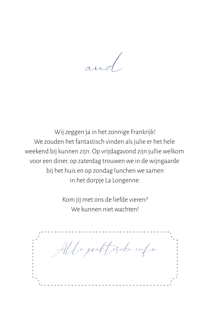 Trouwen jullie in het zonnige Frankrijk? Nodig jullie gasten uit met deze trouwkaart in de vorm van een boarding pass! Deze donkerblauwe trouwkaart heeft goudfolie details en op de achtergrond staat de kaart van Frankrijk. Pas deze trouwkaart zelf aan in onze editor.